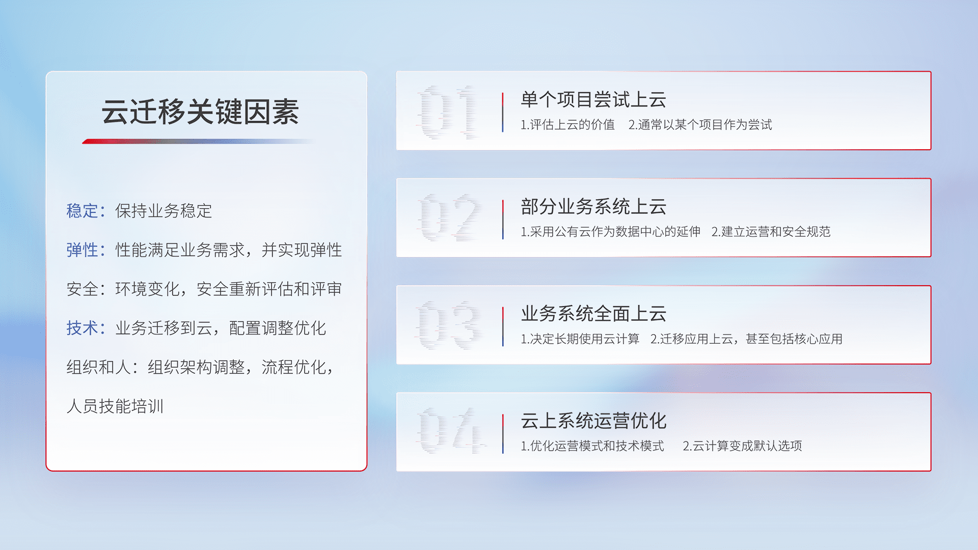 结合实际业务,,,从规划设计、、、、云平台选型、、云原生改造、、、、数据迁移、、、、集成交付,,,,迁移全过程为客户识别最佳上云路径,,,做好风险识别管理,,设计网络架构、、、、身份权限、、、、安全审计合规、、操作审计、、、、日志审计、、、监控告警策略、、、、多站点容灾设计等,,,对云上基础设施进行整体规划,,,提升IT治理水平,,,,以满足弹性、、高可用、、、、高性能的需求。。。。