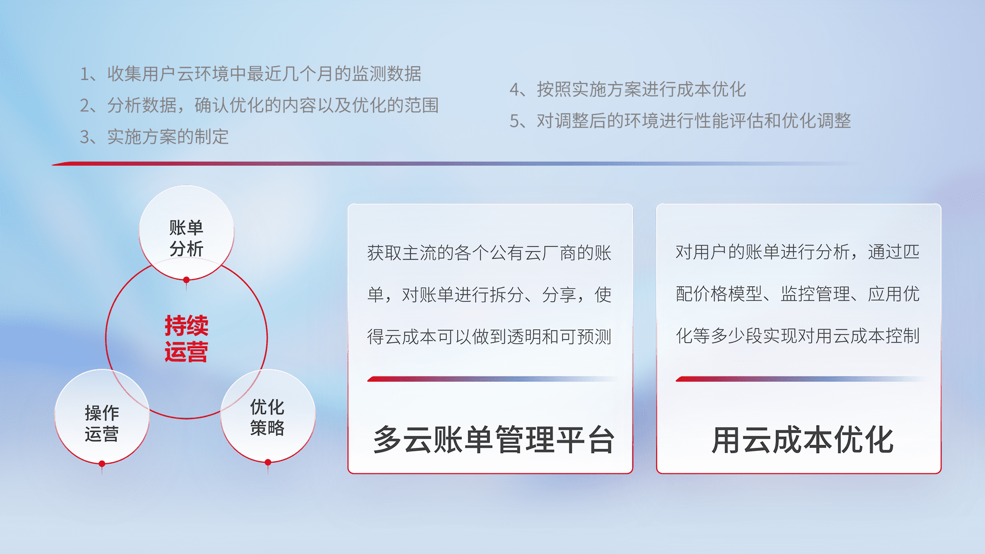 通过多云纳管,,,,以统一的资源数据模型把客户的云资源进行抽象和封装,,进而实现对多云资源的统一操作,,,,保障云资源管理的可靠性、、、、稳定性与可用性。。量身定制化运维内容,,配置、、、开发运维、、补丁管理、、备份、、、、监控、、认证和访问管理、、、、审计和日常巡检等,,,保障在用云过程中的可靠度,,稳定度以及高可用率。。
