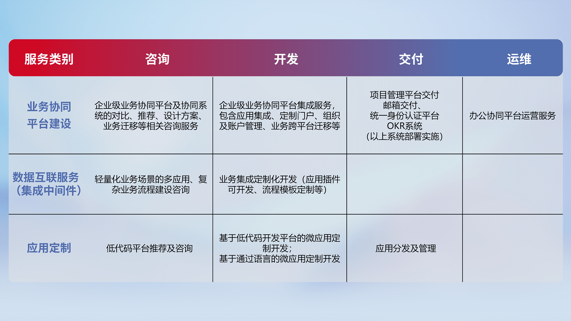 针对钉钉、、、、企微、、、IDaas等平台级产品提供产品的规划、、、方案、、交付、、、定制化开发等服务,,实现如统一协同办公、、、、智能客户服务、、混合会议管理、、、智能数据查询、、等业务场景,,,实现数字化转型。。。。